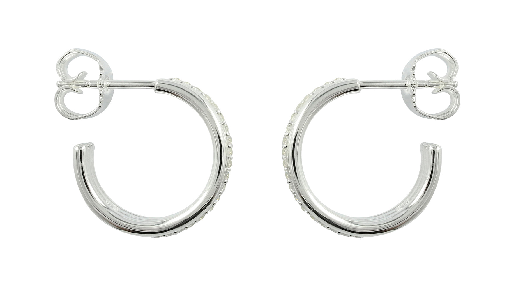 A classy pair of silver hoops with sparkling white zirconia. Polished surface. Cool to combine with the ear cuff.